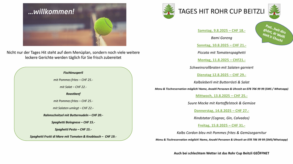 Vom 9. August bis 15. August 2025 messen sich Tennisspieler in verschiedenen Kategorien auf unserer Anlage im Rohr. Auch dieses Jahr haben wir attraktive Preise, welche den Siegern übergeben werden.